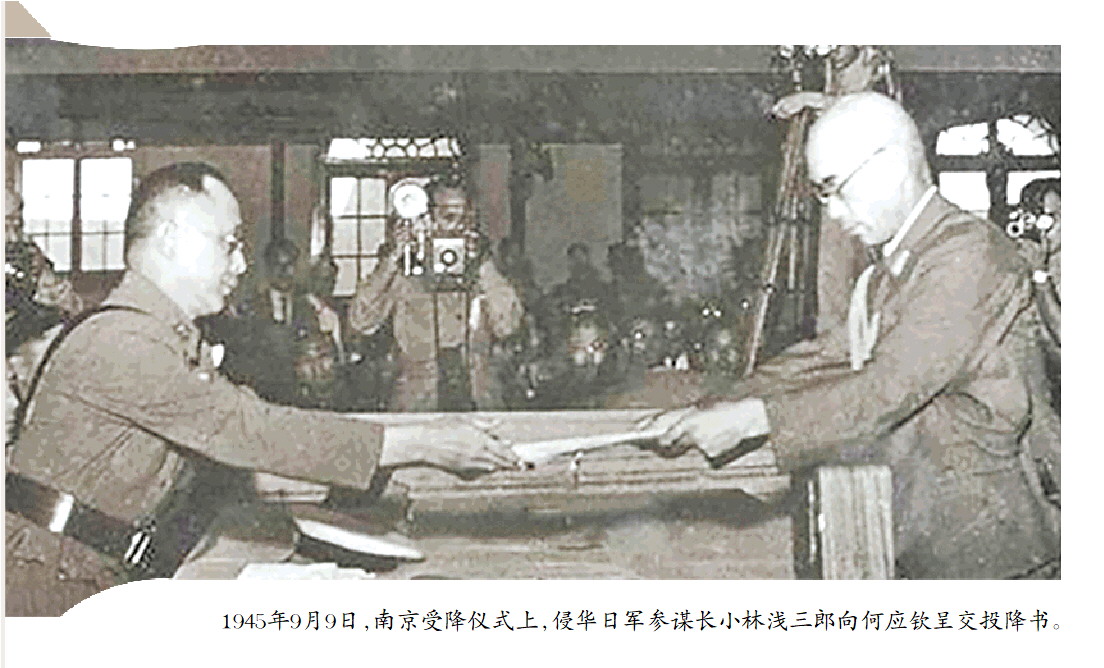 1945年9月9日,南京受降仪式上,侵华日军参谋长小林浅三郎向何应钦呈交投降书。
