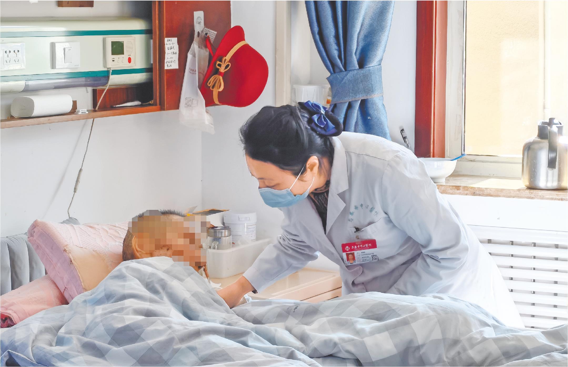 泰安市泰山医养中心护士长仲丽霞正在照护老人。
