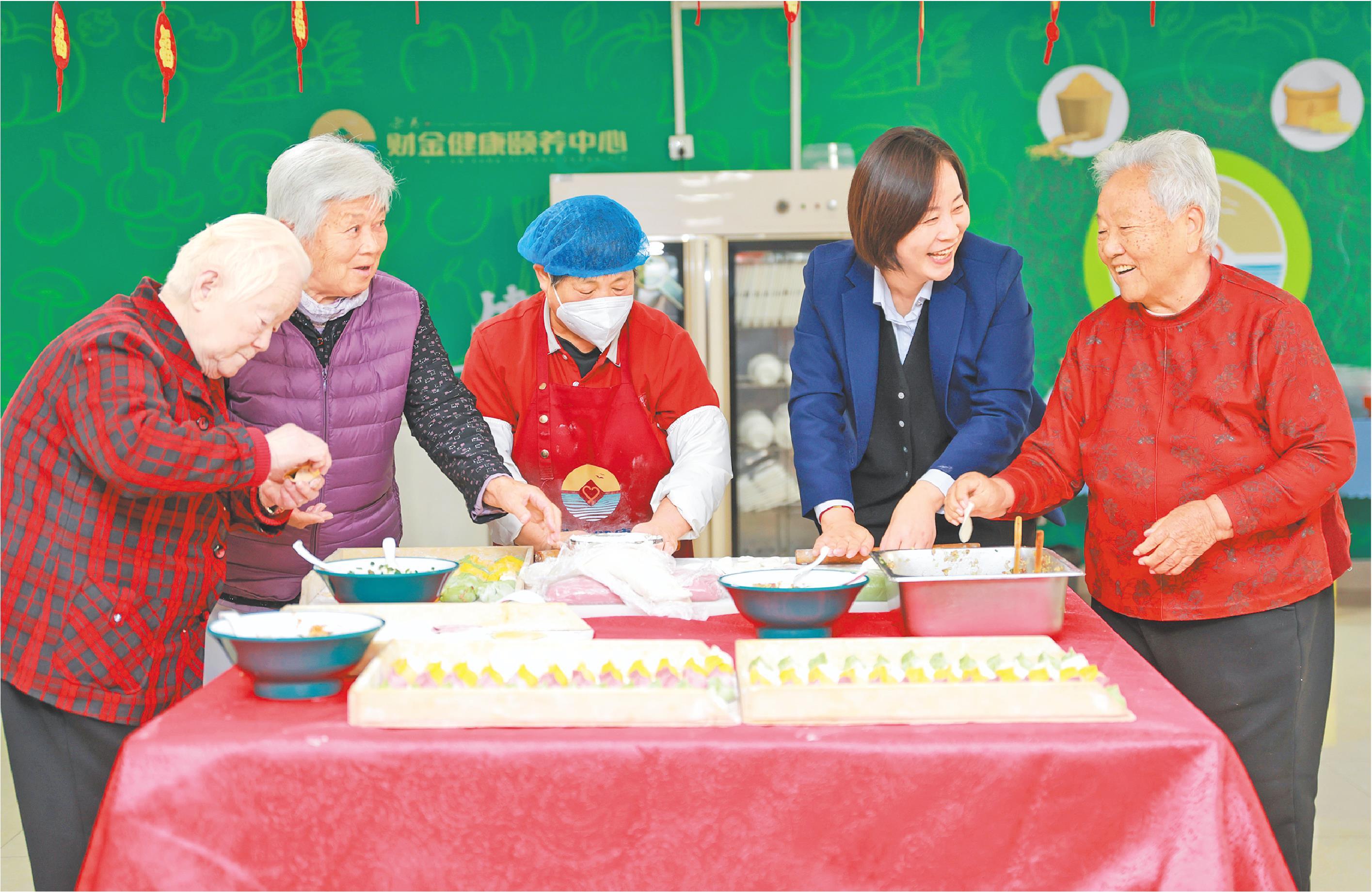10月27日,聊城市茌平区博平镇财金健康颐养中心,工作人员和老人们一起包饺子。