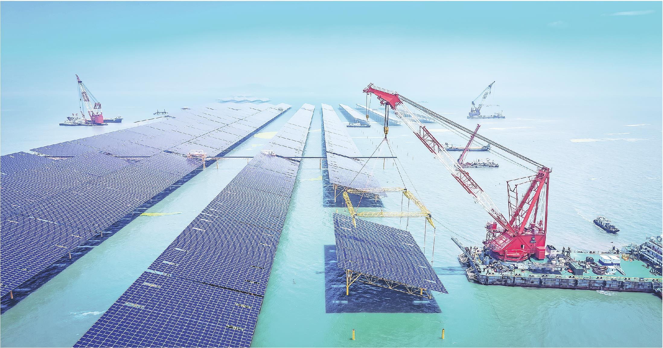 青岛海上“种太阳”,光伏逐浪探新能。图为中电建青岛即墨海上光伏项目建设现场。