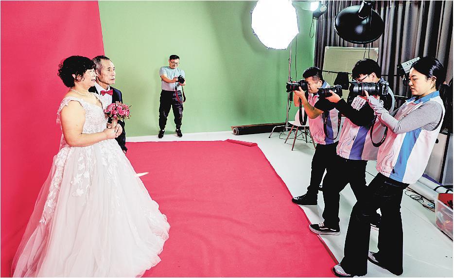 10月29日,农历重阳节。当天,在荣成市新时代文明实践中心摄影棚内,志愿者为金婚老人拍摄婚纱照,用镜头记录他们相濡以沫五十载的幸福。