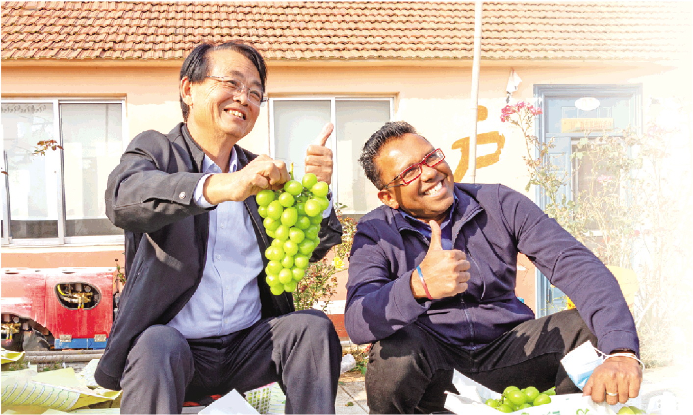 陈松海(左)向联合国粮食计划署工作人员介绍大户庄园的阳光玫瑰葡萄。