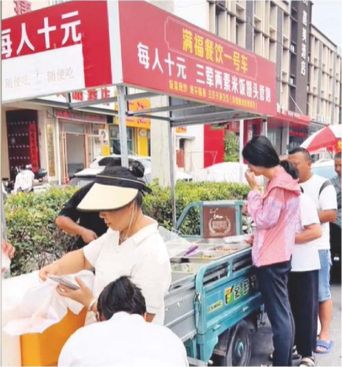 每到中午11点,山东第一医科大学附属肿瘤医院门口,一辆灰蓝色的三轮车便会准时载着“满福餐饮一号车”红色顶棚和热腾腾的饭菜开来,最引人注目的是“每人十元,三荤两素米饭馒头管饱”的标语。