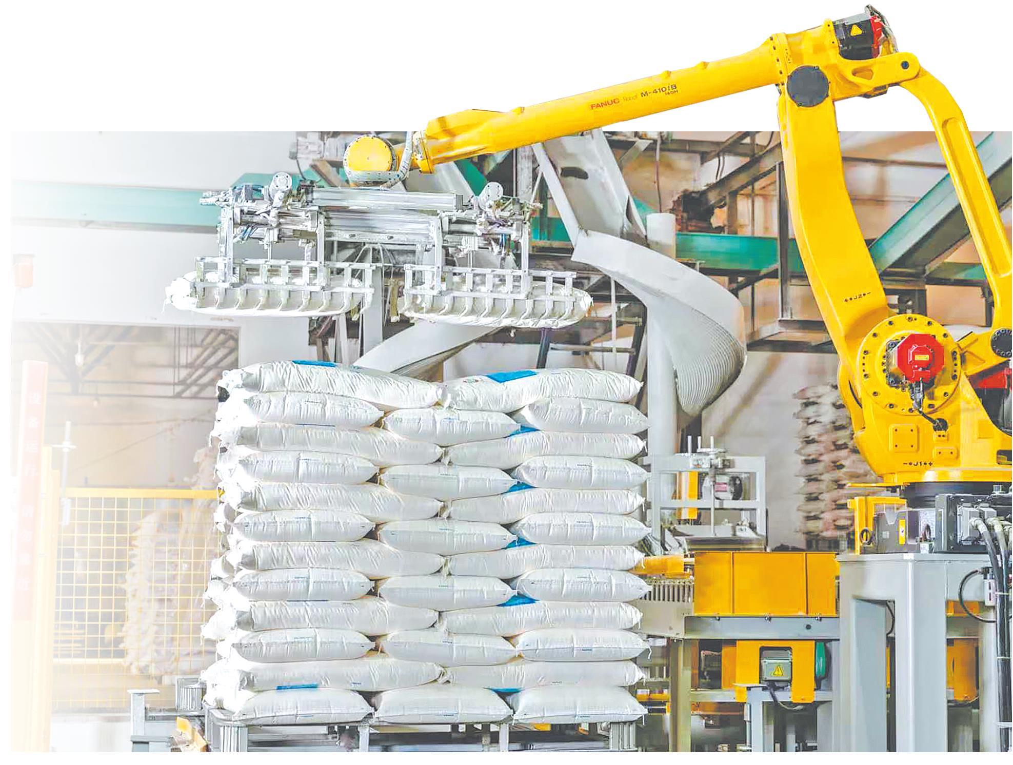 青岛皇丰粮油食品有限公司生产车间内,机械臂正在装卸面粉。(□记者 杨成 报道)
