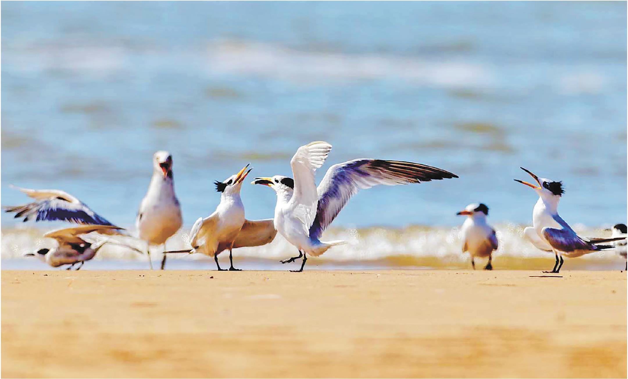 “今年中华凤头燕鸥的数量较去年同期增加了20多只,这离不开日常的环境整治和环保宣传,更得益于全社会保护意识的持续提升。”刘家湾赶海园景区负责人苗中杰介绍,为守护中华凤头燕鸥栖息环境,景区即使在旅游旺季也将游客赶海范围控制在1.5公里之内,预留专属安全空间;每日常态化清理滩涂垃圾,通过广播循环倡导环保理念;联动民宿主理人、环保工作者及摄影爱好者组成“燕鸥保护队”,形成专业守护与全民参与相结合的保护模式。络绎不绝的游客与安然栖息的中华凤头燕鸥,在此实现了和谐共处。