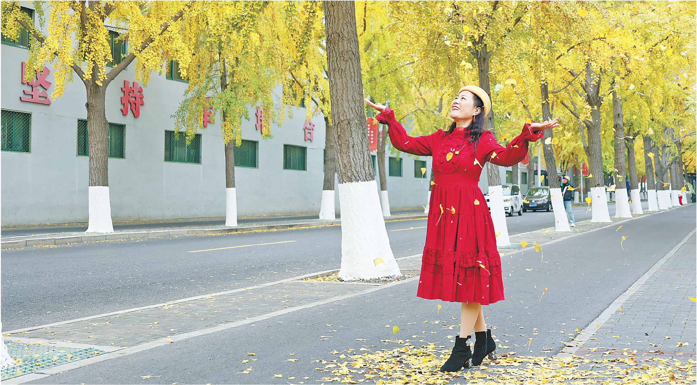 “缓扫”路段执行“一路一策”精细化保洁策略,在保留落叶景观效果的同时,确保环境整洁,实现“只见风景、不见脏乱”,确保自然状、原生态,整体环境整洁优美。图为市民正在市府东一街“打卡”拍照。
