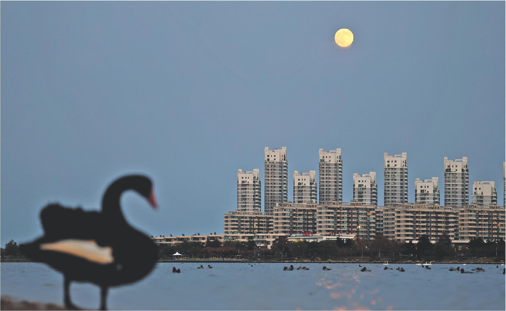 11月5日,荣成樱花湖公园的天鹅在月光下嬉戏觅食。