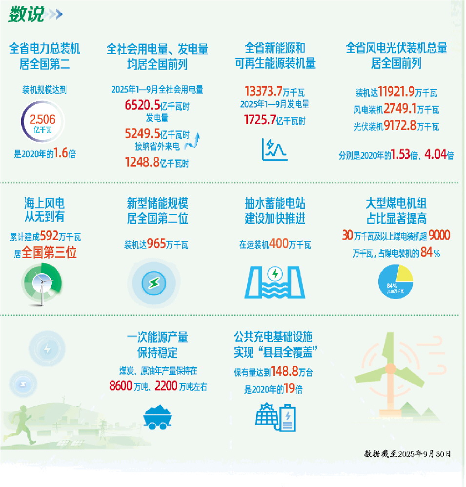 立起电力保供“顶梁柱”。电力是工业发展、社会运转的“血液”,是能源保供的“顶梁柱”。截至目前,建成1200余万千瓦大型高效清洁煤电机组,有力增强电力保供底气;1亿多千瓦风光装机发挥两个“60%”重要作用:午高峰时段风、光发电最高出力占比超过60%,新增风、光发电量占用电量增量比重超过60%,进一步稳固电力供应基础。加强与黄河中上游省份合作,构建起“五交四直”省外来电发展格局,接纳外电能力达到3800万千瓦,2025年送入电量将超1600亿千瓦时,占全社会用电量的近20%,有力支撑我省电力安全供应。截至2025年9月底,电力总装机达到2.5亿千瓦,居全国第二位,省内机组发电量将突破7000亿千瓦时,相当于7个三峡水电站的发电量。2025年迎峰度夏期间,在经济、气温“双重热度”带动下,电网负荷常态化破亿,山东多措并举、协调联动,成功应对全网用电负荷8创历史新高、午晚高峰38天同日“双破亿”的挑战,既顶住了峰、又兜住了底,全省实现“无感度夏”。