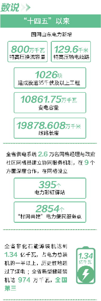 “十四五”的五年,是山东电力推动能源转型、服务绿色发展的五年,深入践行绿水青山就是金山银山理念,坚定当好新型电力系统建设“主力军”,风光装机在全国率先突破亿千瓦,新能源装机达1.25亿千瓦,领跑省级电网绿色转型;