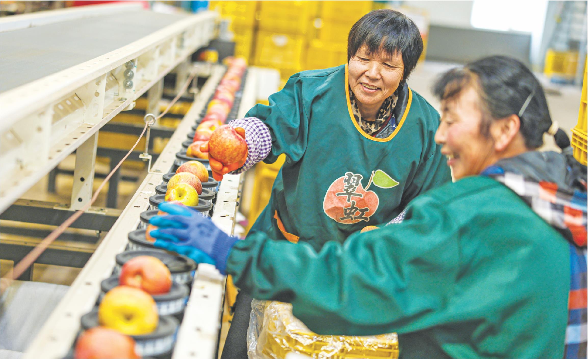 连日来,在荣成市城西街道一处苹果气调保鲜仓库内,妇女们对刚刚采获的苹果进行分拣、整理、包装,随后通过电商平台订单销往全国各地。
