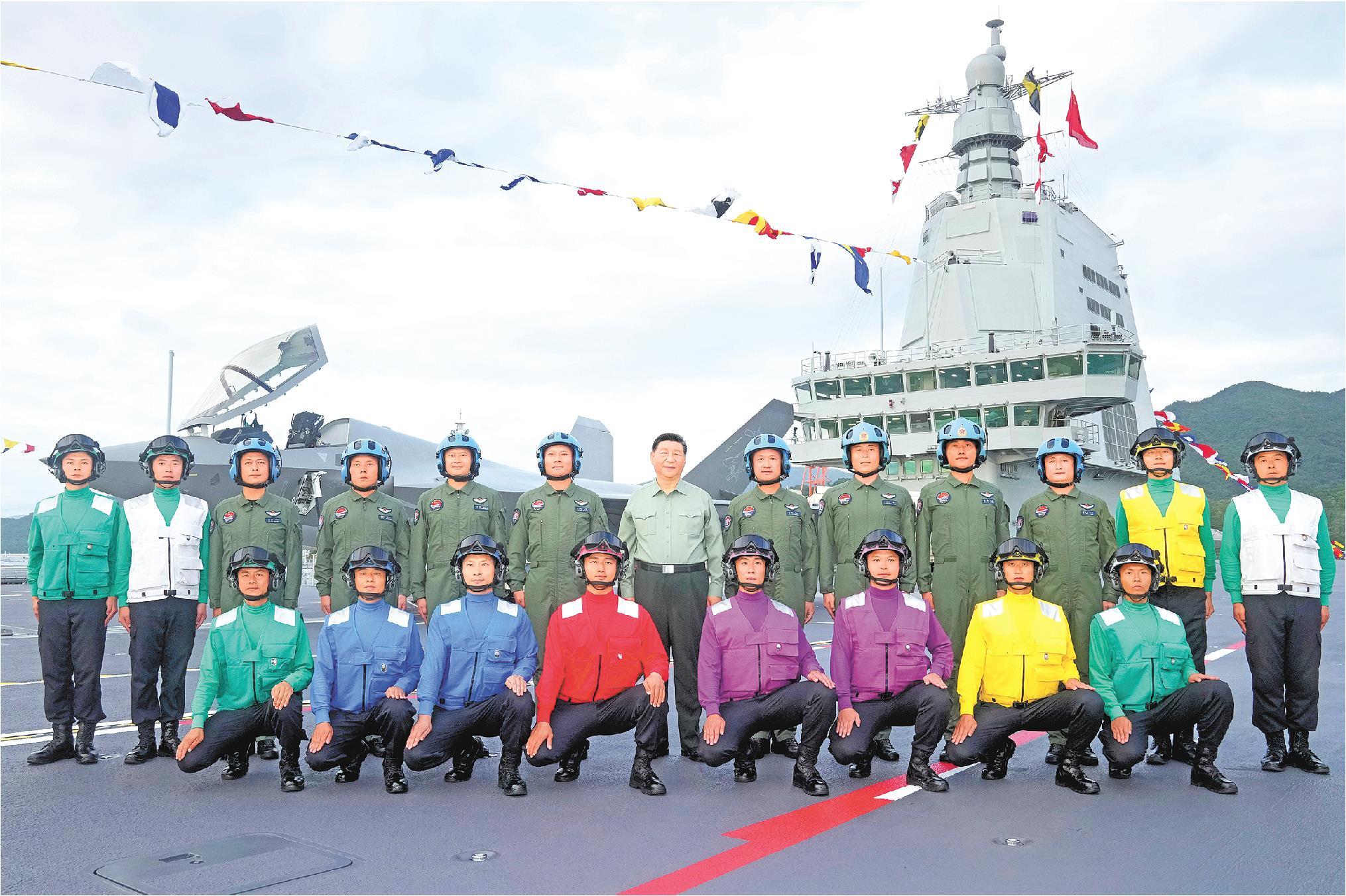 11月5日,我国第一艘电磁弹射型航空母舰福建舰入列授旗仪式在海南三亚某军港举行。中共中央总书记、国家主席、中央军委主席习近平出席入列授旗仪式并登舰视察。这是习近平同舰载机飞行员、航空保障人员合影留念。