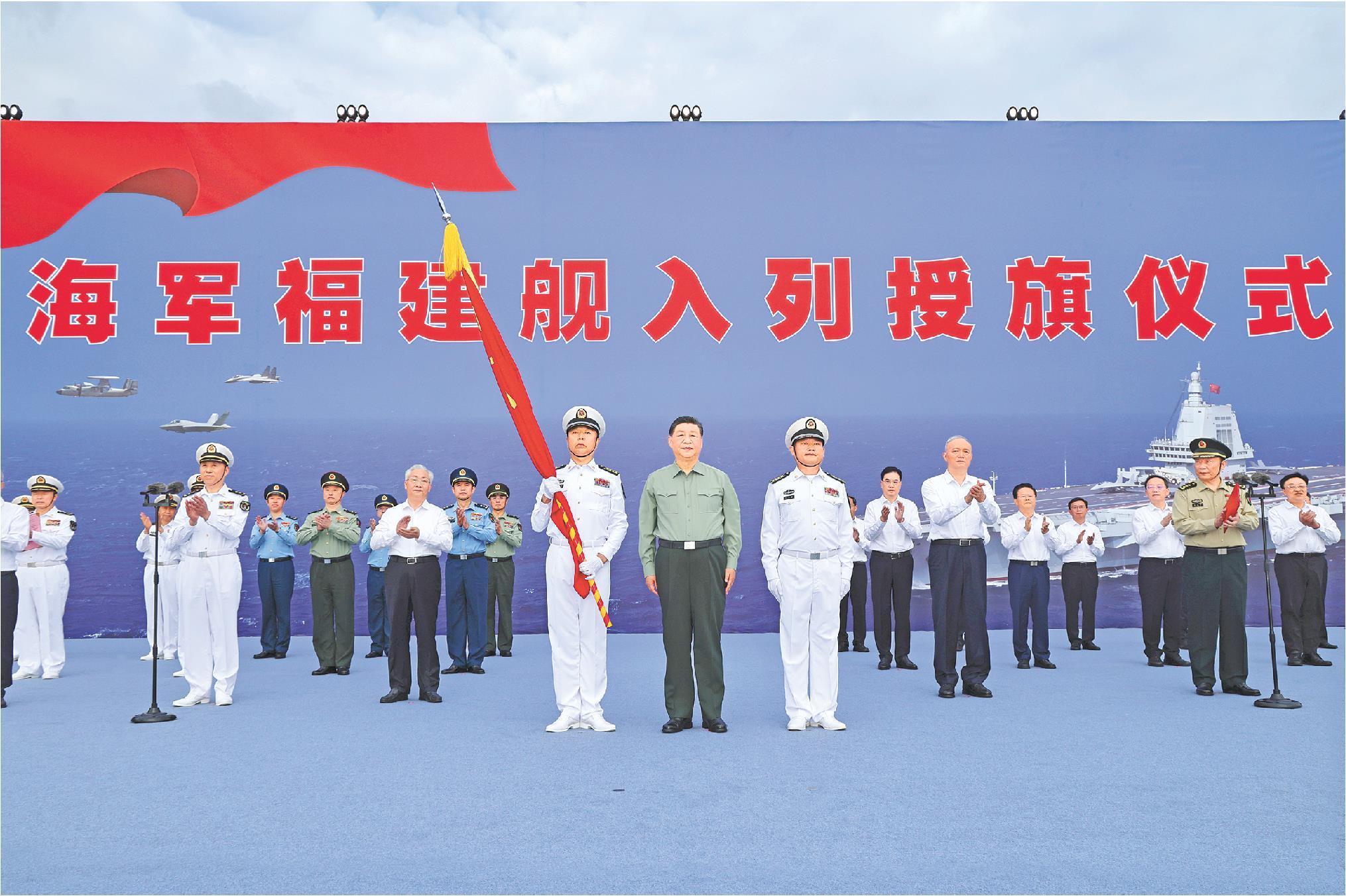 11月5日,我国第一艘电磁弹射型航空母舰福建舰入列授旗仪式在海南三亚某军港举行。中共中央总书记、国家主席、中央军委主席习近平出席入列授旗仪式并登舰视察。这是习近平向福建舰舰长、政治委员授予军旗。