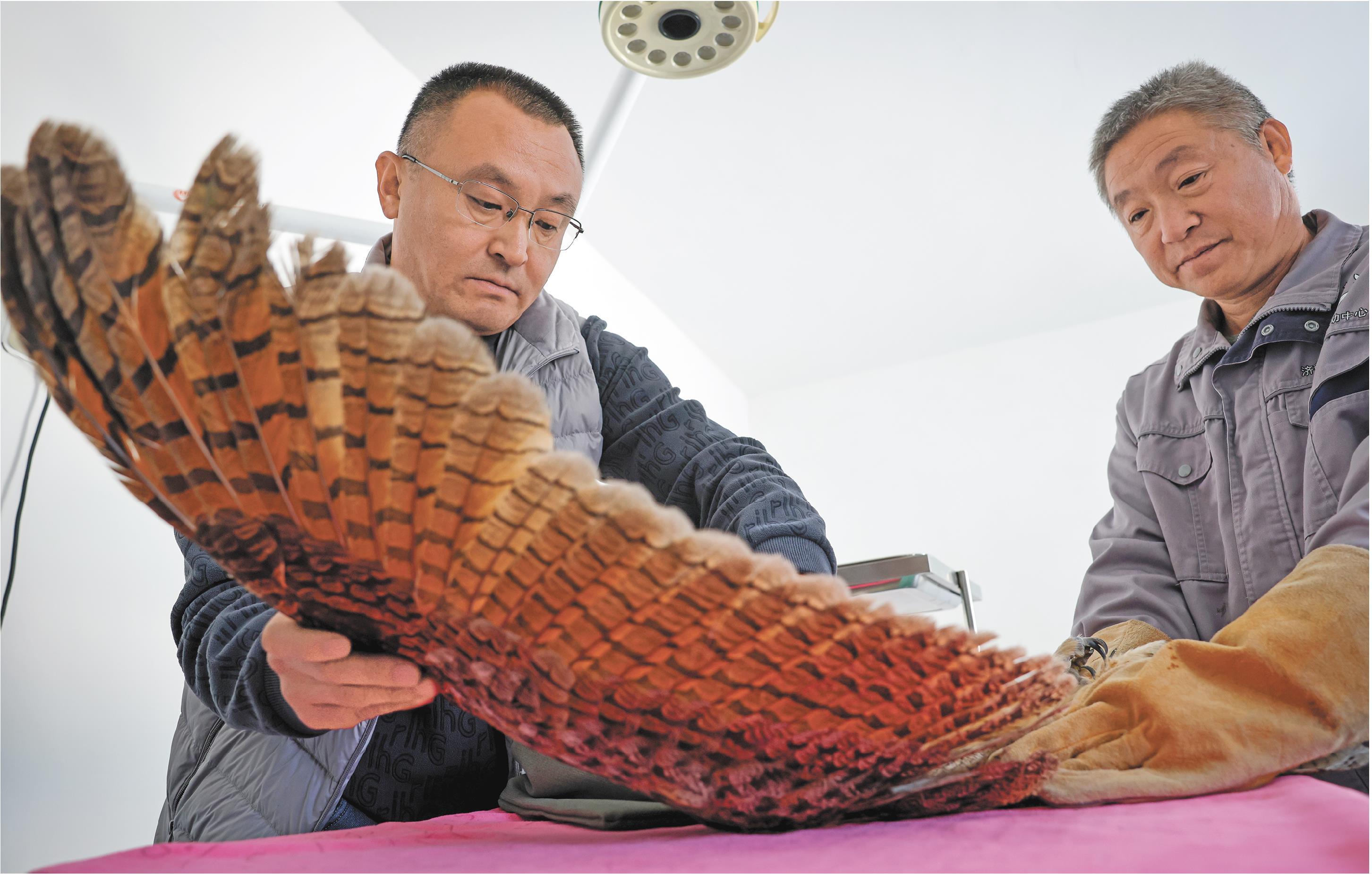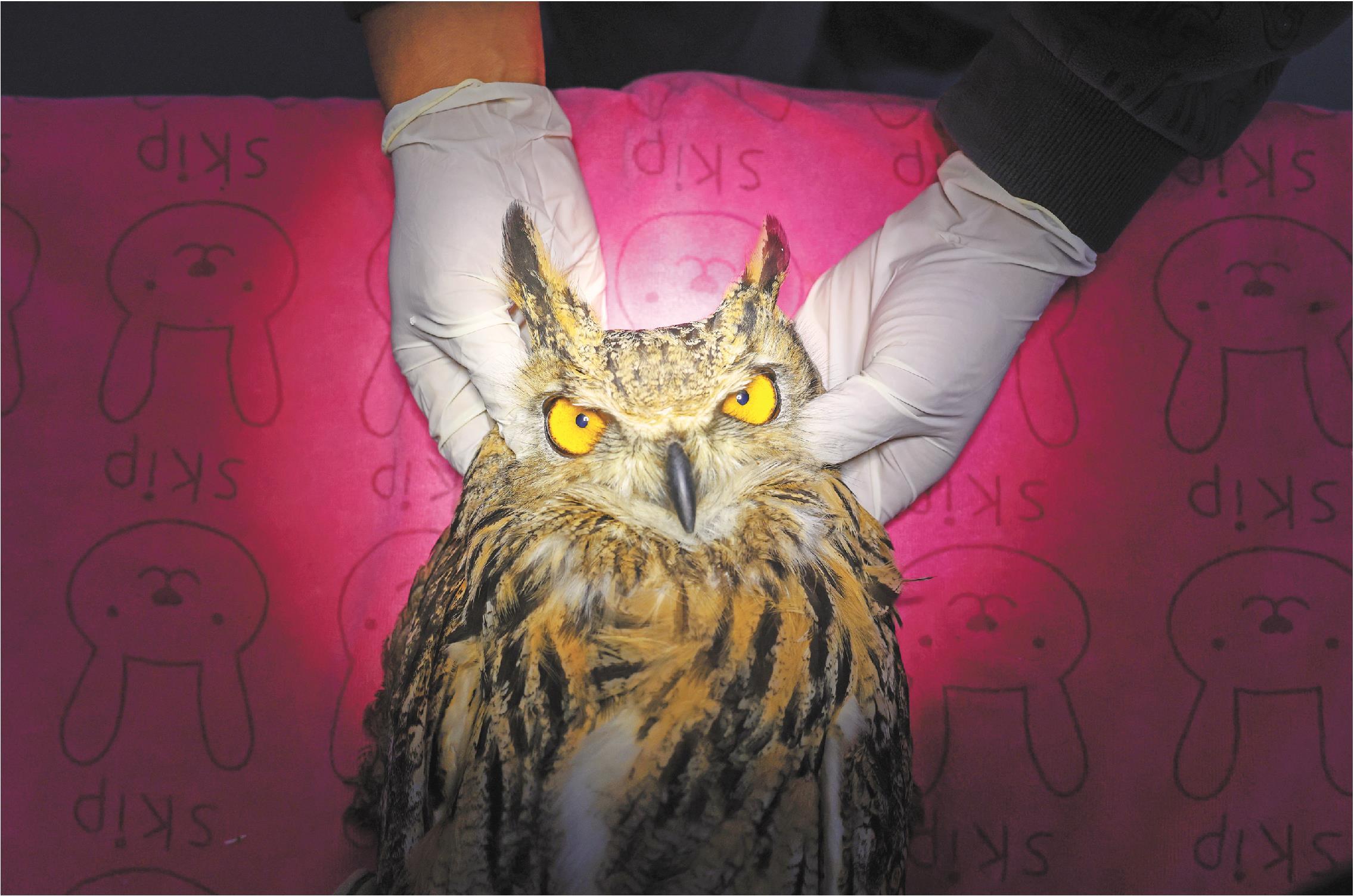 胡海磊(左)、牛兆理查看一只雕鸮翅膀恢复情况。
