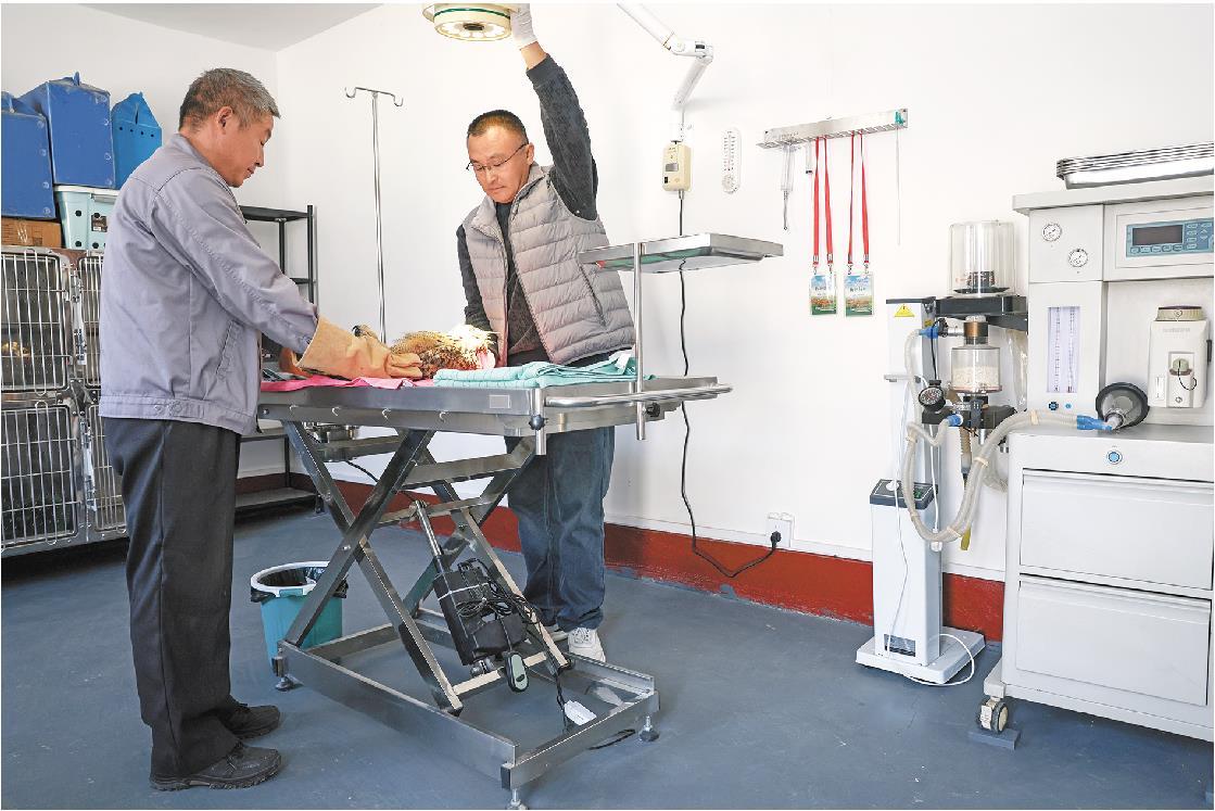 治疗室内的设备齐全,胡海磊和牛兆理为雕鸮体检。