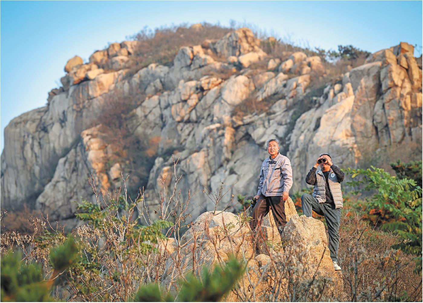 11月4日傍晚,胡海磊(右)、牛兆理一同来到大寨山查看候鸟过境情况。