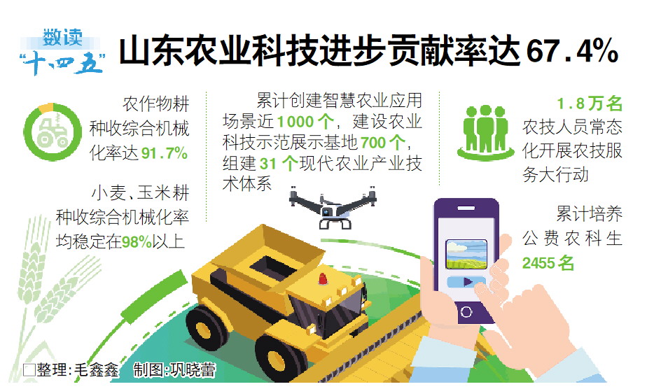 近年来,山东以科技创新和数字建设为关键支撑,赋能农业农村发展。在科技创新方面,突出抓好农业科技领军企业培育,遴选建立1000家科技企业库,强化智能农机装备研发推广,全省农业科技进步贡献率达到了67.4%;在数字建设方面,实施数字农业突破行动,建设“齐鲁农云”数字乡村大脑,已累计创建智慧农业应用场景近1000个。