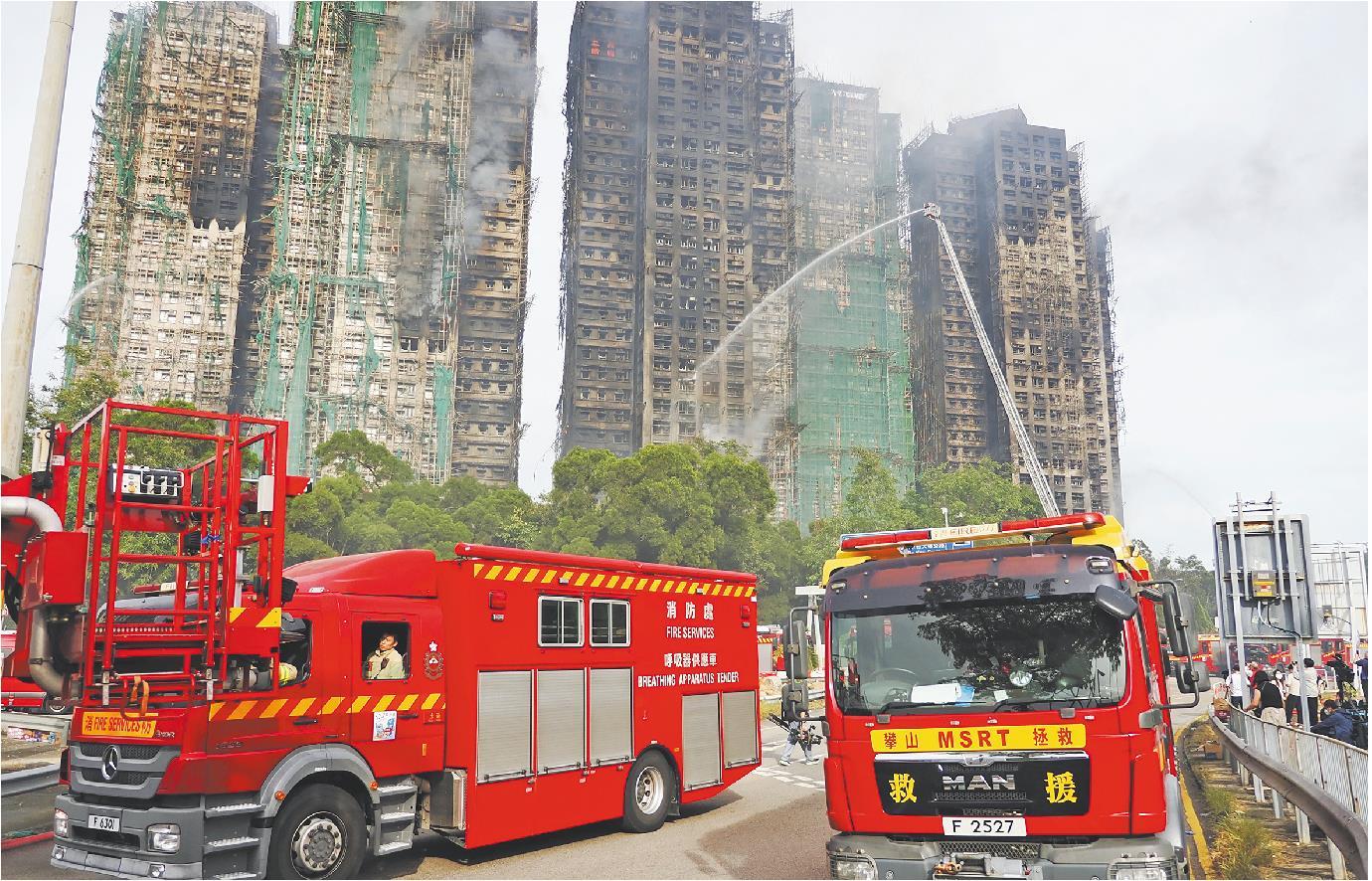 这是11月27日拍摄的香港新界大埔区宏福苑火灾救援现场。(□新华社发)