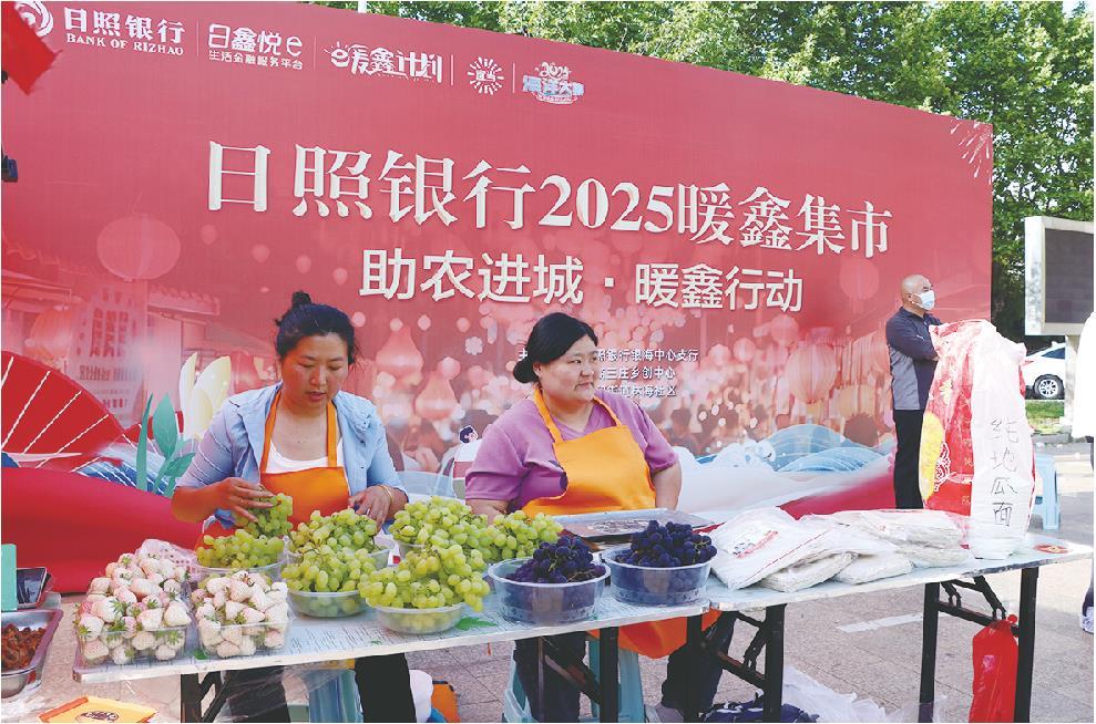 2025年5月17日,两名商户在日照银行“暖鑫集市”售卖水果等农产品