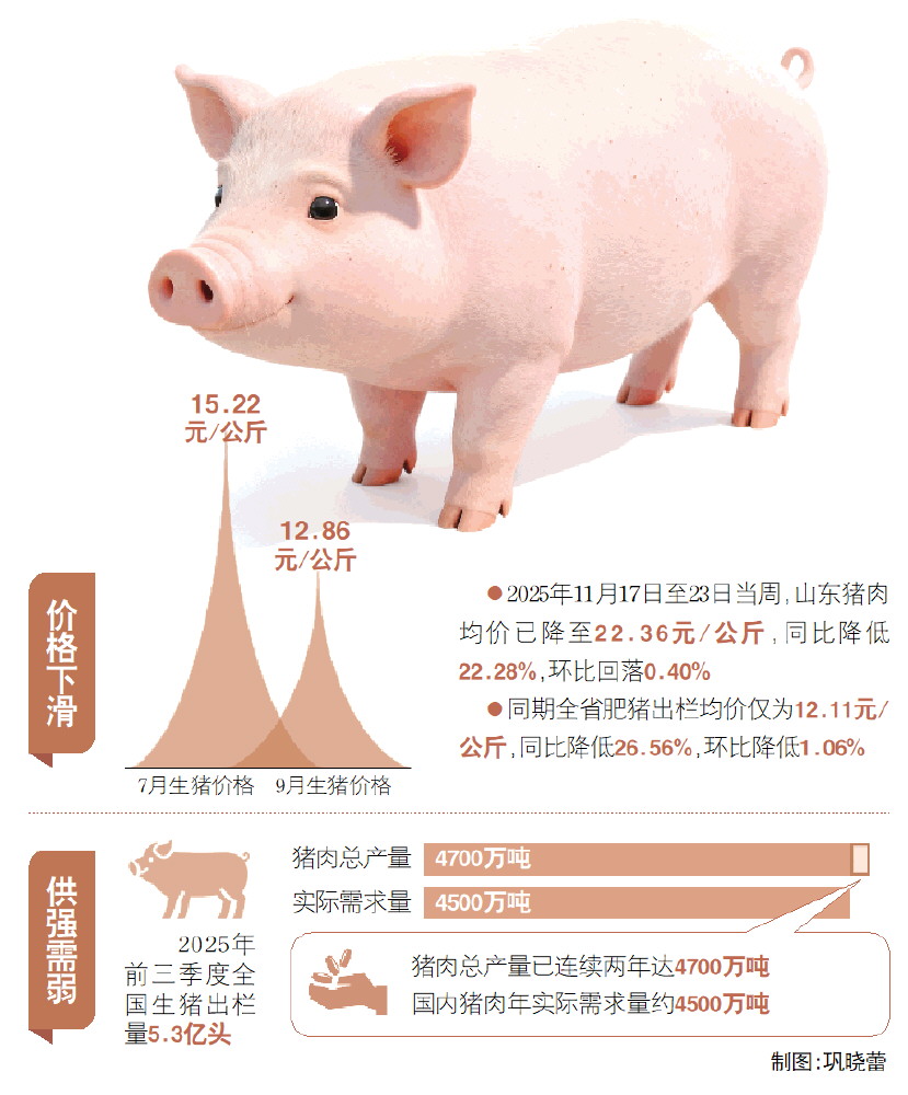 省畜牧兽医局监测数据显示,自今年1月中旬山东省猪肉均价达到28.79元/公斤、肥猪出栏均价达到16.46元/公斤的峰值后,价格便一路震荡下滑。入夏后,受消费淡季影响,生猪价格由7月初的15.22元/公斤降至9月末的12.86元/公斤,养殖效益陷入亏损区间。11月17日至23日当周,山东省猪肉均价降至22.36元/公斤,肥猪出栏均价降至12.11元/公斤。此价格下,自繁自养模式头均亏损约80元,外购仔猪育肥模式头均亏损约160元。