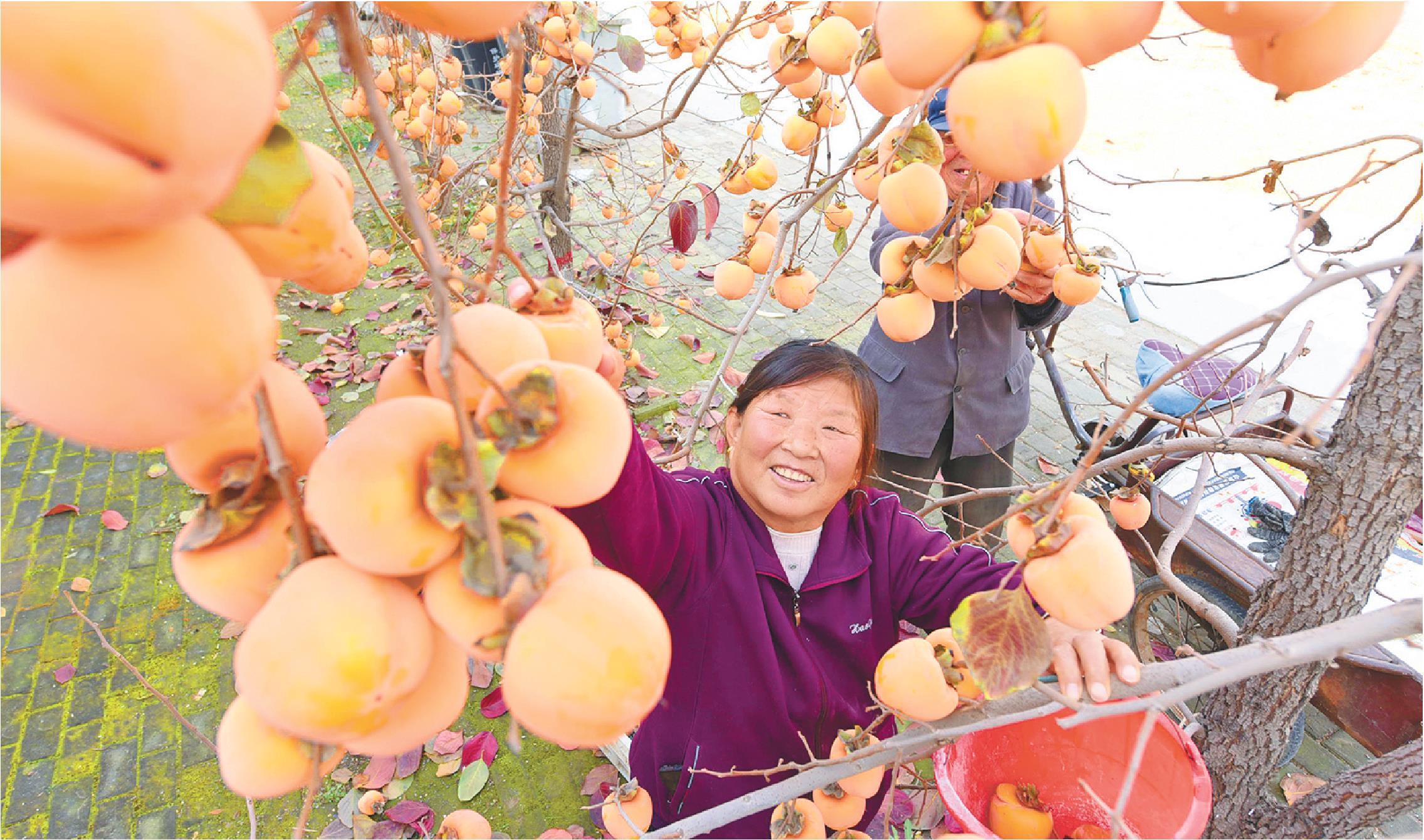 11月25日,在阳谷县寿张镇冀王村,村民正在采摘房前屋后成熟的甜柿子。眼下,阳谷县寿张镇的甜柿子进入成熟期,房前屋后、大街小巷,沉甸甸挂满枝头,宛如一盏盏小灯笼,成为乡村一道独特的美景。