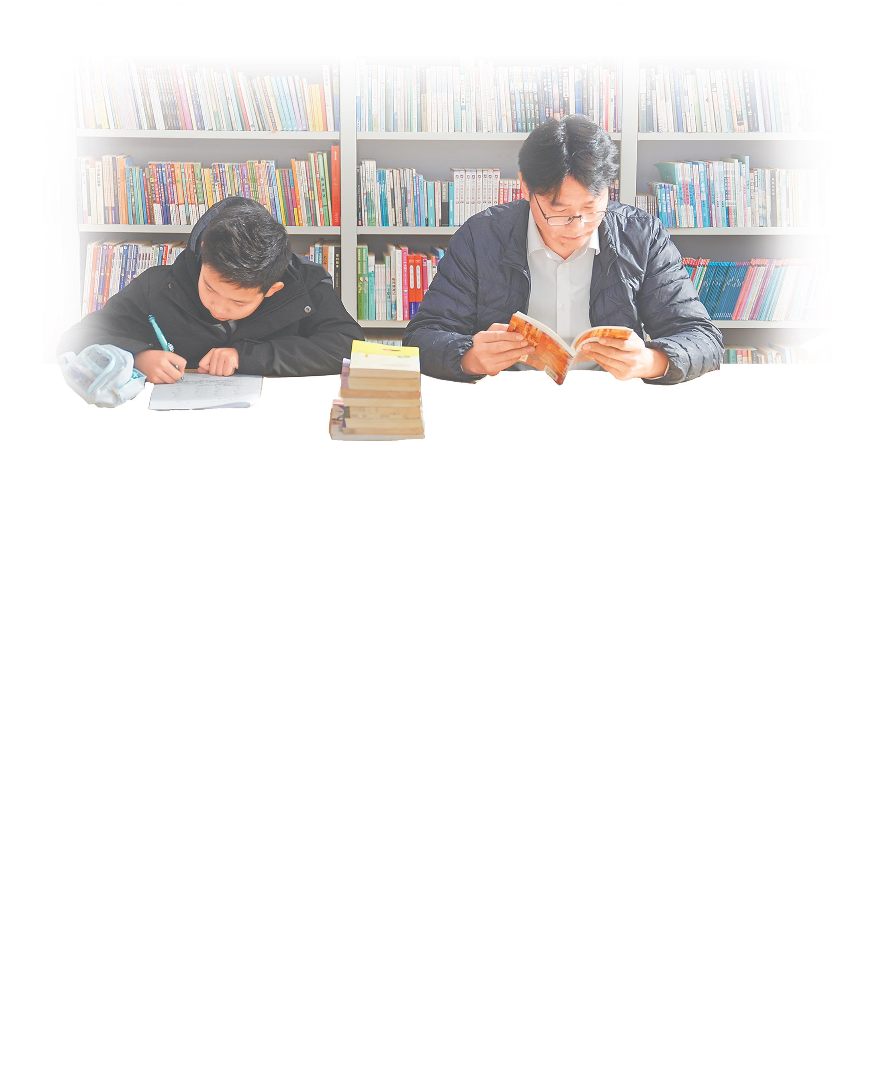 周庆贵与小读者在思源图书馆一起看书。