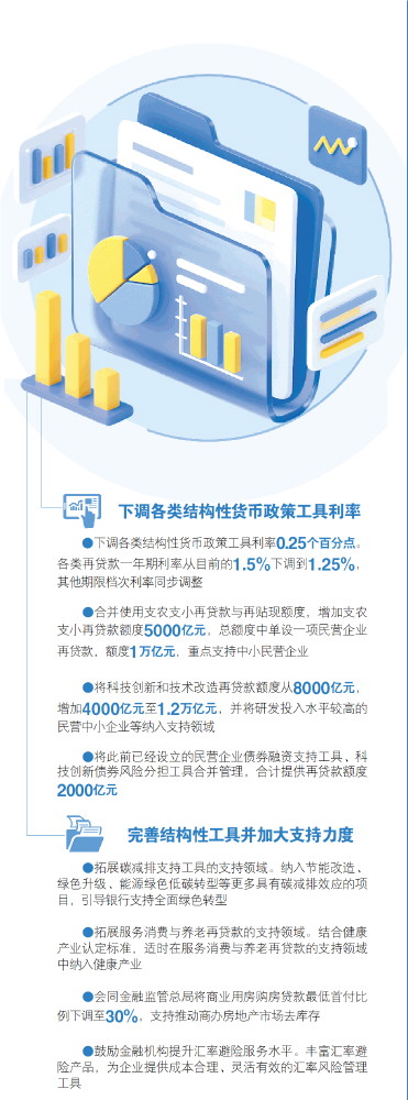 具体包括:下调各类结构性货币政策工具利率0.25个百分点,增加支农支小再贷款额度5000亿元,将科技创新和技术改造再贷款额度增至1.2万亿元,合并设立科技创新与民营企业债券风险分担工具,拓展碳减排支持工具的支持领域,拓展服务消费与养老再贷款的支持领域,会同金融监管总局将商业用房购房贷款最低首付比例下调至30%,鼓励金融机构提升汇率避险服务水平。
