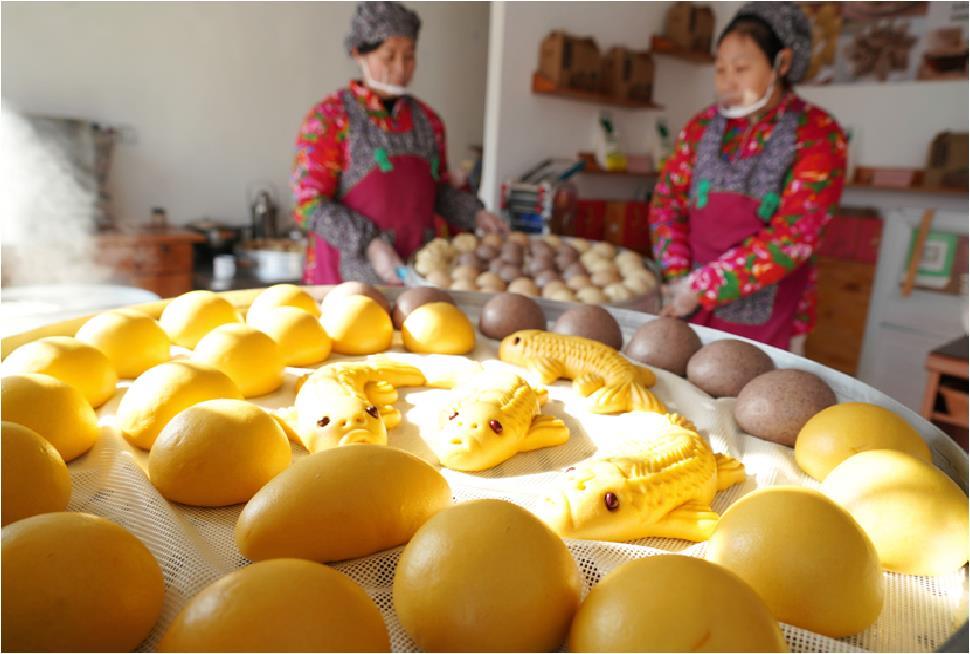 1月12日,在沂南县诸葛良田“共富工坊”,村民在搬运刚出锅的花样馒头。