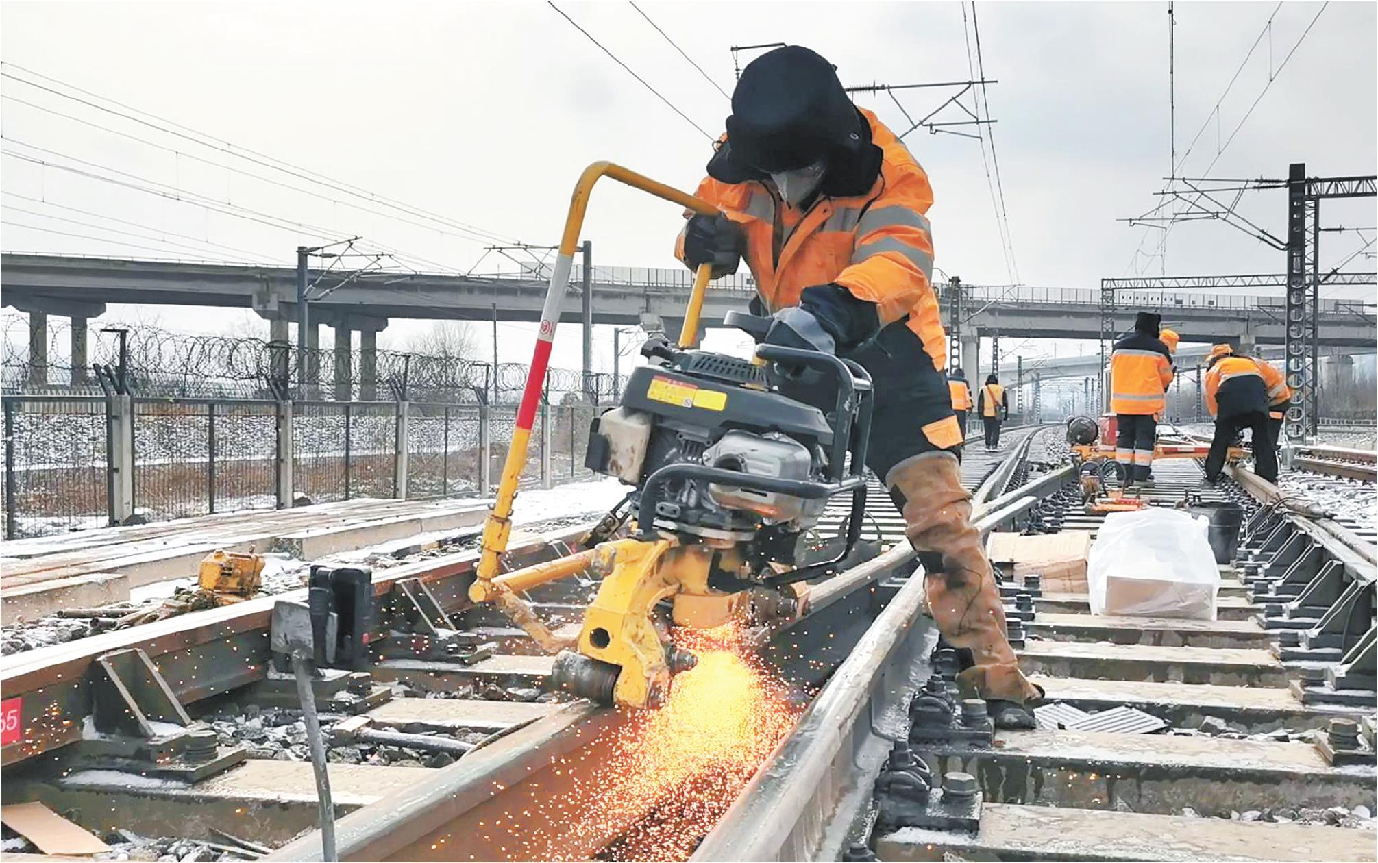 1月19日,国铁济南局济南工务段工作人员在党家庄站进行钢轨打磨。