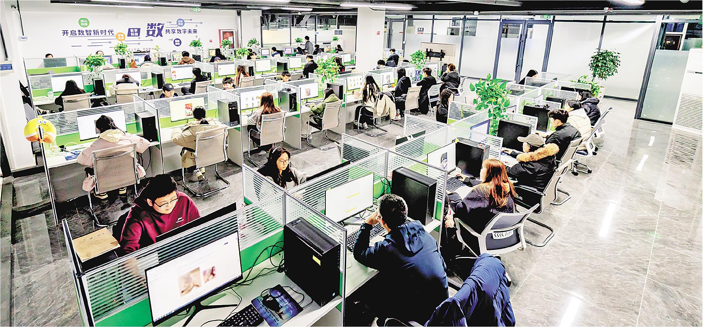 图为位于日照数字服务外包基地的山东中开数字科技集团工作室内,工作人员正在进行数据标注工作。
