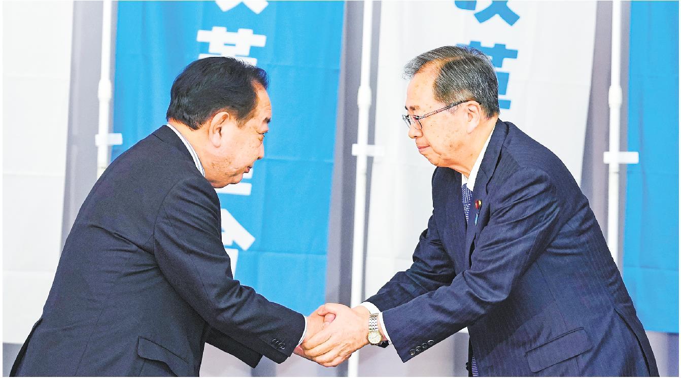 1月22日,日本东京,“中道改革联合”共同代表野田佳彦(左)与齐藤铁夫在建党大会上握手。