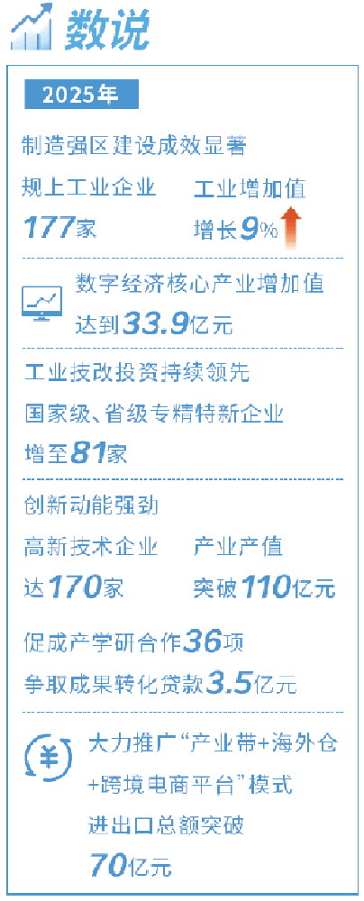 2025年,任城区制造强区建设成效显著,规上工业企业达177家,工业增加值增长9%。高端装备、新材料等主导产业壮大,多个十亿级项目建成投产。数字经济核心产业增加值达到33.9亿元,智联信通自研软件获评第九批全省首版次高端软件。前瞻布局未来产业,与北大共建空天信息实验室及低空经济产业园。工业技改投资持续领先,国家级、省级专精特新企业增至81家。创新动能强劲,高新技术企业达170家,产业产值突破110亿元。促成产学研合作36项,争取成果转化贷款3.5亿元、全市第一。