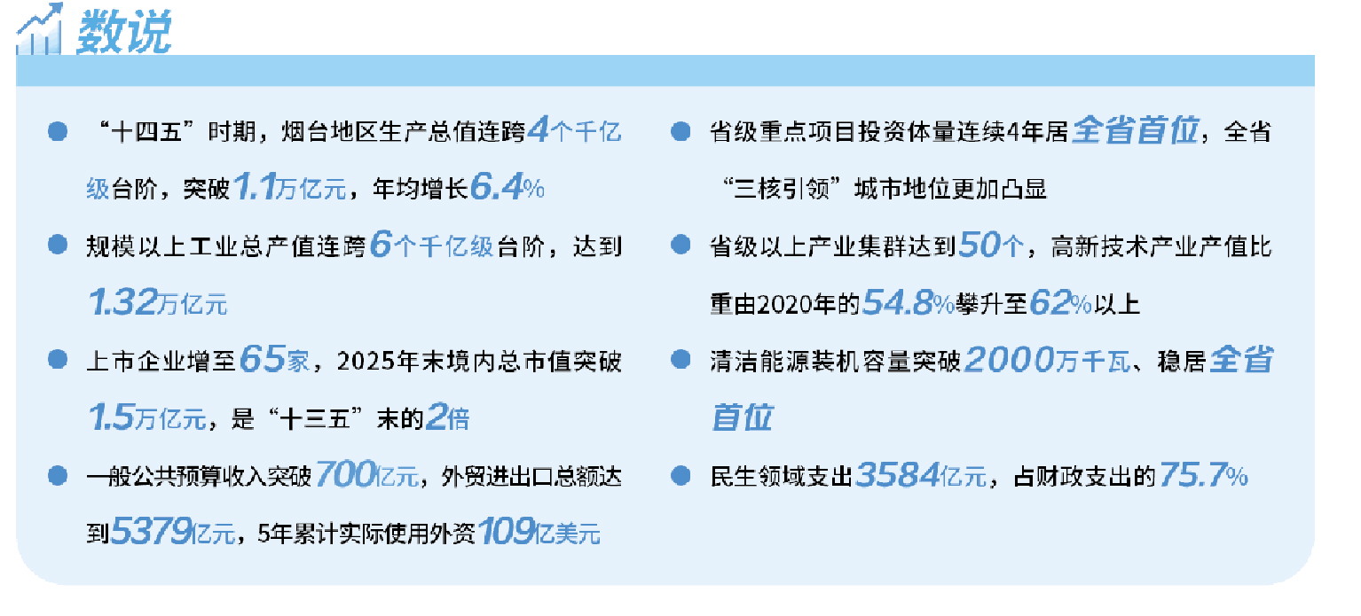 从地区生产总值连跨4个千亿级台阶,成为北方首个万亿地级市,到规模以上工业总产值达到1.32万亿元,铸就坚强工业脊梁;从全国首个海上发射母港腾空而起、星耀苍穹,到全国首个零碳供暖城市温情启航、暖透万家;从3584亿元民生支出织密幸福保障网,到1662个老旧小区改造焕新市井烟火气……“十四五”时期,烟台用实干与担当书写了一部量质齐升的发展诗篇。站在“十五五”开局的历史节点,这座城市正以产业为骨、创新为魂、绿色为脉、民生为根,在加快打造绿色低碳高质量发展示范城市、建设新时代社会主义现代化强市的道路上,续写更加璀璨夺目的崭新篇章。