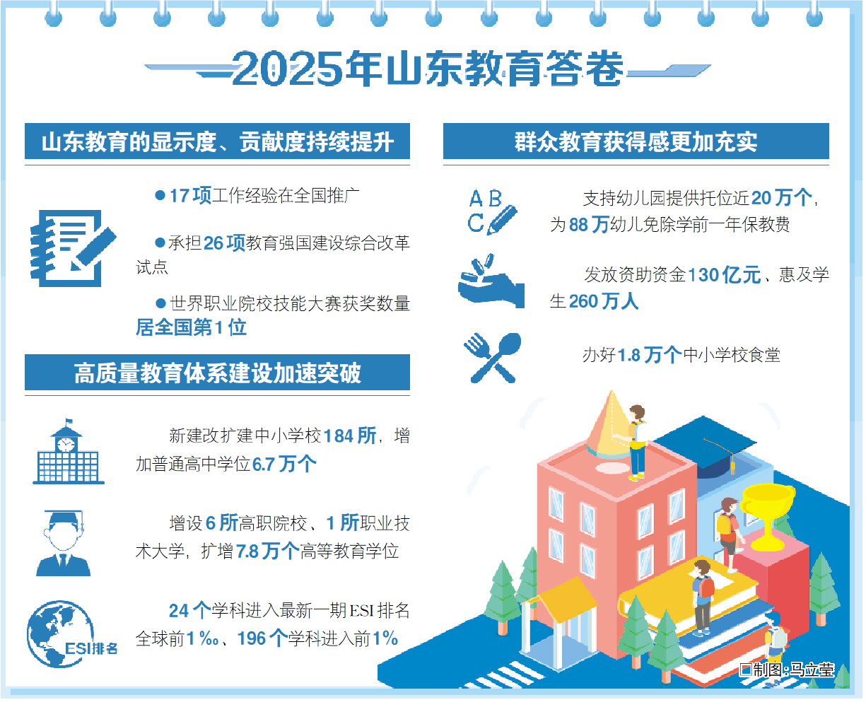刚刚过去的2025年,山东教育交出了一份厚重提气的答卷:17项工作经验在全国推广,承担26项教育强国建设综合改革试点,全国学前教育普及普惠和义务教育优质均衡发展县数量分居全国第2、第3位,世界职业院校技能大赛获奖数量居全国第1位,山东教育的显示度、贡献度持续提升。