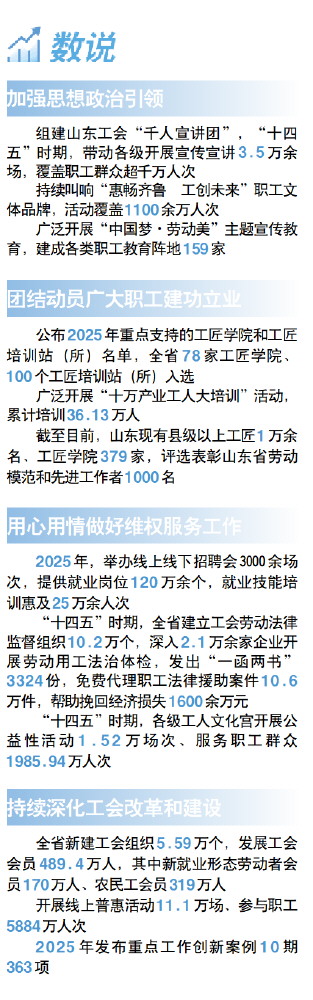 坚决筑牢法治保障,“十四五”时期,省总工会推动省人大常委会出台《山东省工会劳动法律监督条例》、修订《山东省实施〈中华人民共和国工会法〉办法》。全面推行新时代“枫桥经验”工会实践,健全“工会+法院+检察院+人社+司法”协作联动机制,全省建立工会劳动法律监督组织10.2万个,深入2.1万余家企业开展劳动用工法治体检,发出“一函两书”3741份;建设932家工会法律援助实体机构(站点),完善山东工会网上法律服务管理系统,督促市县两级总工会调解力量全部入驻本级已建综治中心,实现劳动争议“商、调、裁、诉、援、执”全链贯通,免费为职工提供法律援助服务11.3万余件次。