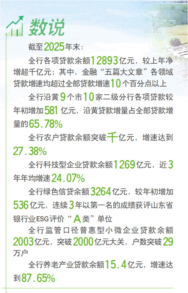 回顾往昔,从泰山之巅到沿海渔港,从黄河之畔到蒙山沂水,齐鲁大地上,山东农行人用脚步丈量山河,以服务尽显担当。展望未来,该行将锚定“十五五”发展蓝图,持续加大信贷投放力度,深度融入全省经济社会发展大局,以高质量金融服务谱写助力现代化强省建设的新篇章。