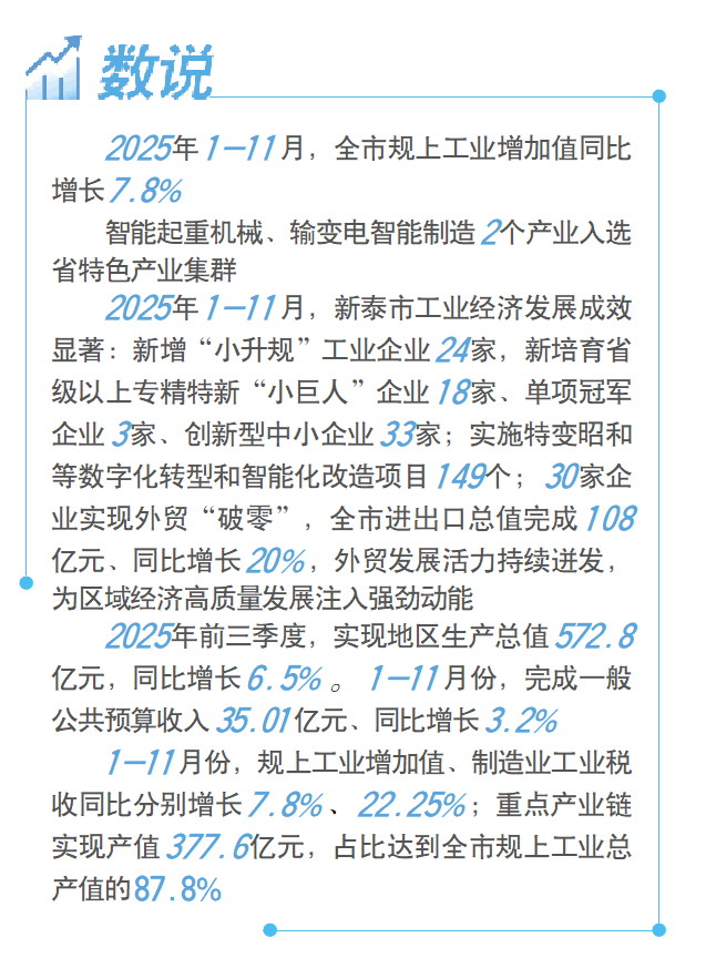 近年来,新泰市紧紧围绕推进工业经济“头号工程”,强化顶层设计、工作统筹、体系建设,集中兵力、整合资源,全力做好“稳、立、聚”三篇文章,推动工业经济实现新跨越新提升。新泰市先后获评全省工业强县、高质量发展进步县、促进工业稳增长和转型升级成效明显县,智能起重机械、输变电智能制造2个产业入选省特色产业集群。2025年1—11月,全市规上工业增加值同比增长7.8%,固定资产投资同比增长11.4%,工业强市的根基愈发坚实。