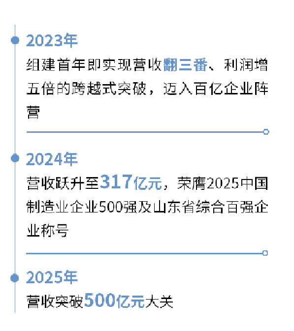 自正式组建以来,“三体两翼”战略成效显著,屡创佳绩:2023年,组建首年即实现营收翻三番、利润增五倍的跨越式突破,迈入百亿企业阵营;2024年,营收跃升至317亿元,荣膺2025中国制造业企业500强及山东省综合百强企业称号;2025年,营收突破500亿元大关。