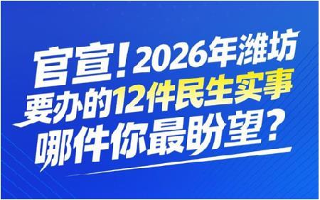 本报潍坊讯 潍坊市民,赶快领取年度民生礼包啦!1月22日,记者从2026年潍坊市新办民生实事新闻发布会上获悉,潍坊市政府工作报告中提出新办的12件民生实事(扫二维码看详情)目前已在全面推进中。