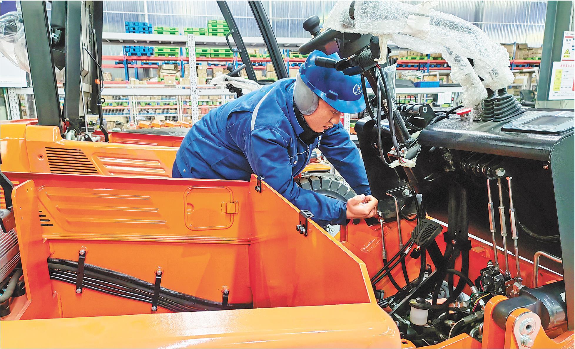 近日,在山东恒基集团股份有限公司智能电动叉车生产车间,技术人员正对一批发往国外的产品进行调试。该公司近年来持续强化转型升级,加强自主创新和投资力度,推动生产模式从传统制造向数字智造升级。
