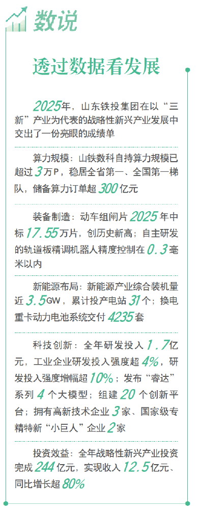“我们坚持向新向绿向未来,锚定新科技、新能源、新装备等战略性新兴产业,推动业务、资源向战新领域协同发力。”山东铁投集团党委书记、董事长王卫中表示,2025年,集团高质高效完成专业化整合,全年战略性新兴产业投资244亿元,实现收入12.5亿元、同比增长超80%。面向“十五五”,山东铁投集团转型发展、可持续发展的动能更加充沛,必将书写下国有企业高质量发展的新的时代答卷。