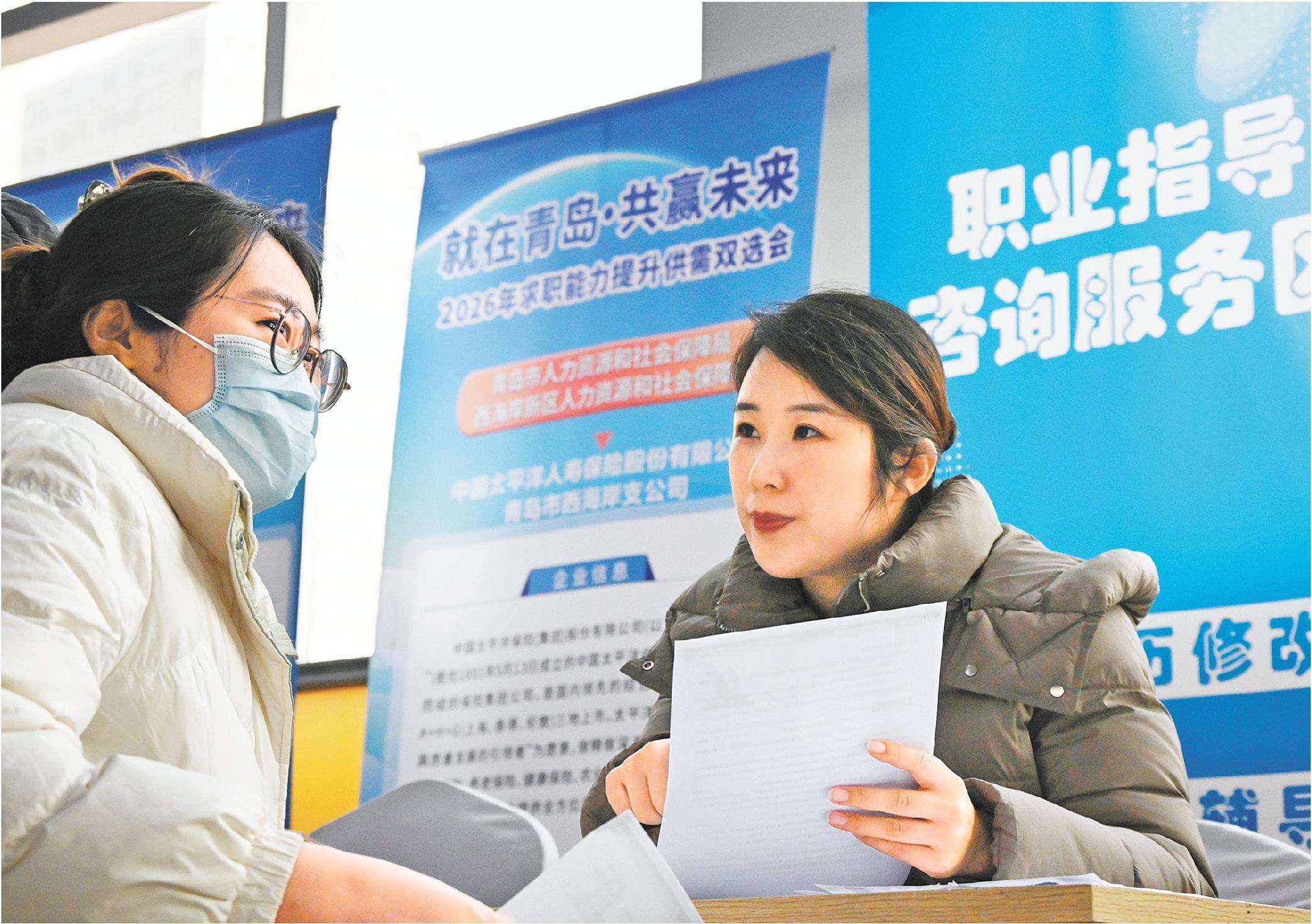 1月30日,青岛西海岸新区人力资源大市场就业指导咨询服务区,工作人员为求职者答疑解惑。
