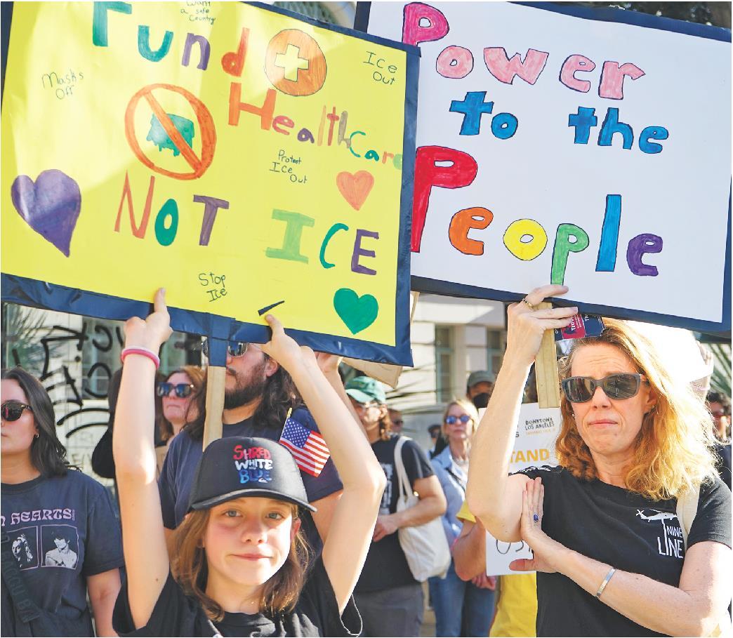 1月31日,人们在美国加利福尼亚州洛杉矶市政厅前手举标语参加示威活动。作为由“50501运动(50场抗议,50个州,1个运动)”组织的反对移民和海关执法局“全国行动日”的一部分,加利福尼亚州南部地区多座城市当日举行了示威活动。