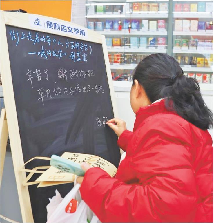 快递员、大学生、退休老人在小黑板上的朴素书写,恰是其情绪价值空间功能的直接体现。他们为生计忙碌,也在买水找零的空隙,写下对生活的感怀。而借由这种接力书写,这个“便利生活、抚慰心灵”的服务空间,成为“文学创作来源于生活”的具象化呈现。