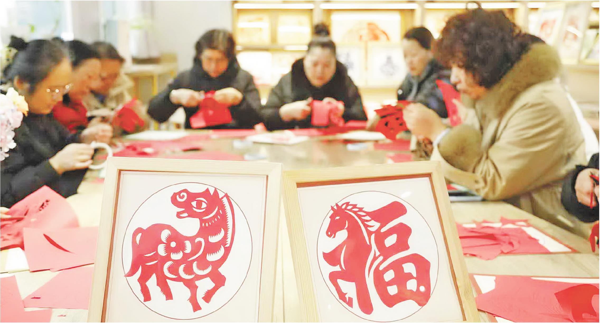 图为1月30日,居民在学习剪制含有“马”元素的“福”字,准备送给邻里邻居。