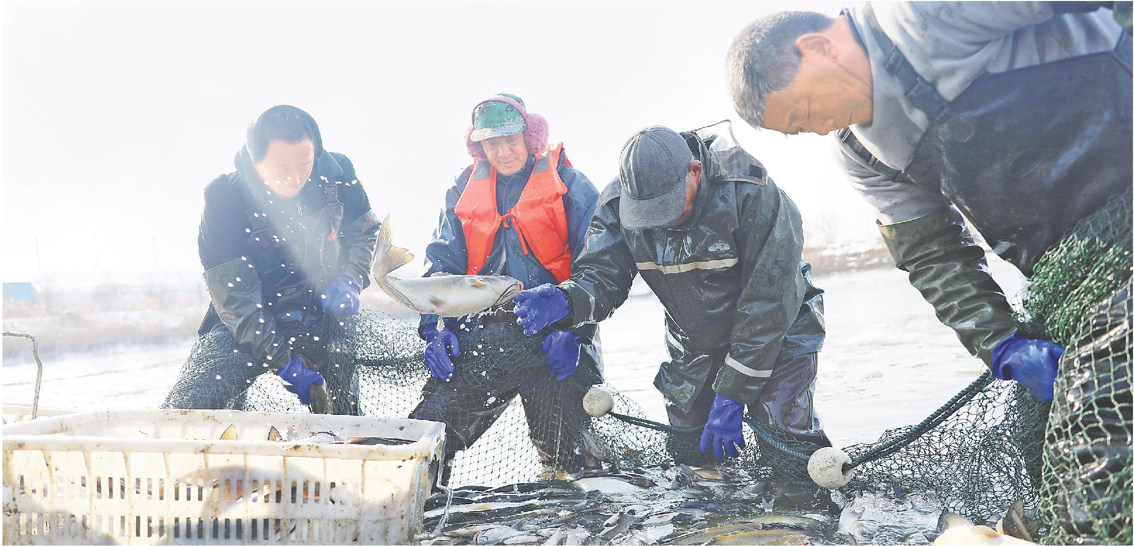 临近春节,在枣庄市峄城区底阁镇,渔民们正在破冰拉网。捕获的鲜鱼经过分拣后,将被迅速发往徐州、济南、北京等地,供应春节市场。当地利用治理后的塌陷水面,采用“以鱼净水、以水养鱼”的生态养殖模式,实现了生态与经济效益的双赢。
