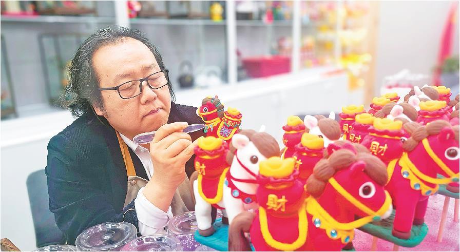 农历马年将至,枣庄面塑非遗代表性传承人梁军在进行马元素面塑新年伴手礼的创作。通过国潮化创新设计,他将“马上发财”“马上有福”等经典民俗祈愿融入文创产品,让非遗技艺走进寻常百姓生活。
