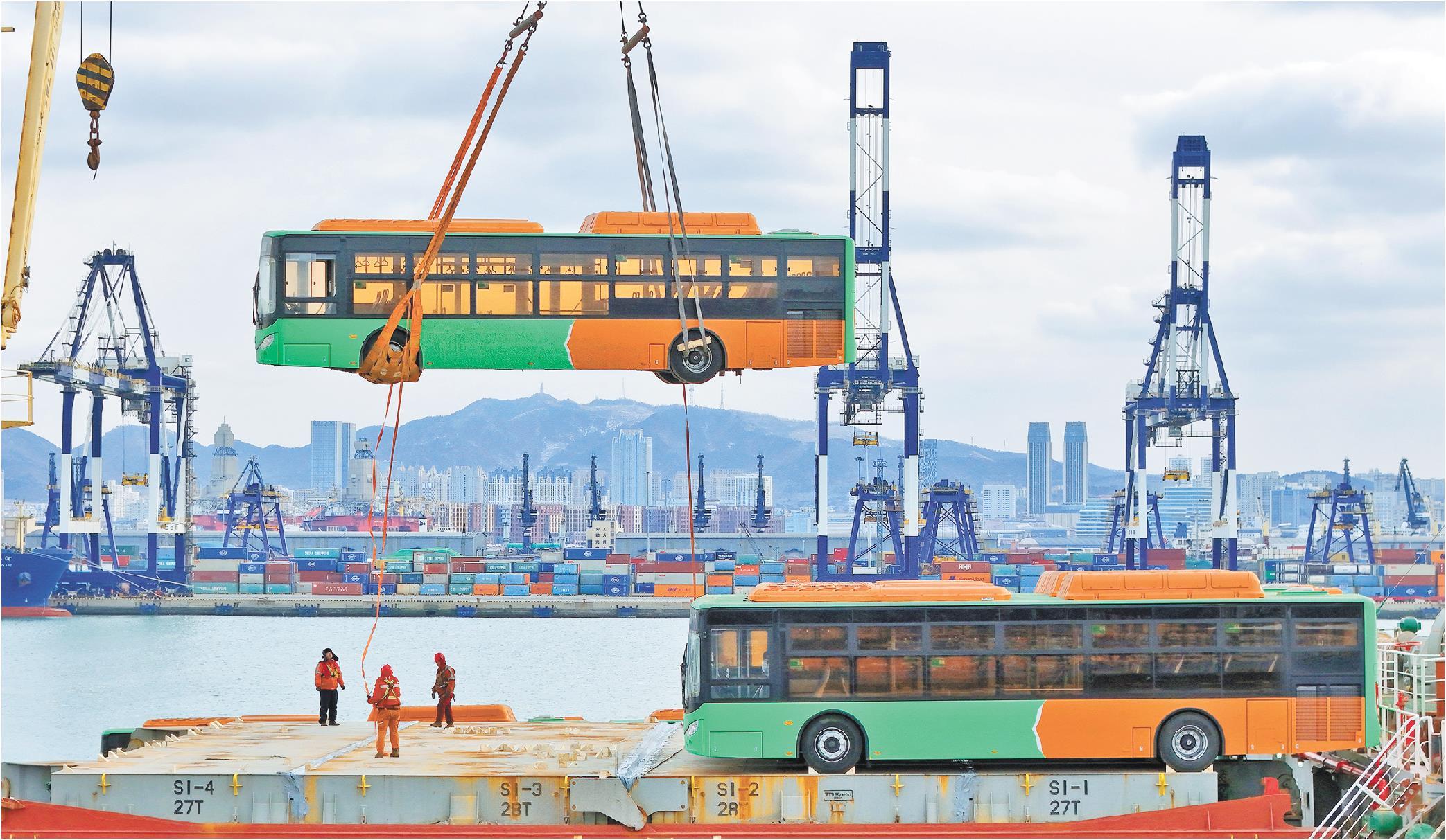 2月6日,出口墨西哥的天然气公交车在山东港口烟台港装船。