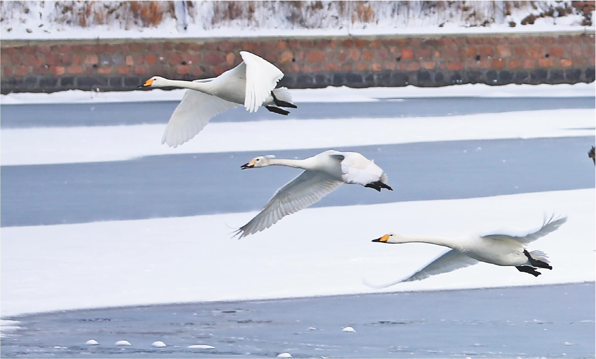 2月7日,荣成市天鹅湖迎来立春后的第一场降雪。成群的大天鹅迎着洁白春雪,在湖畔休憩、游弋、飞舞,构成一幅幅唯美生态画卷,宛如冰雪童话世界。