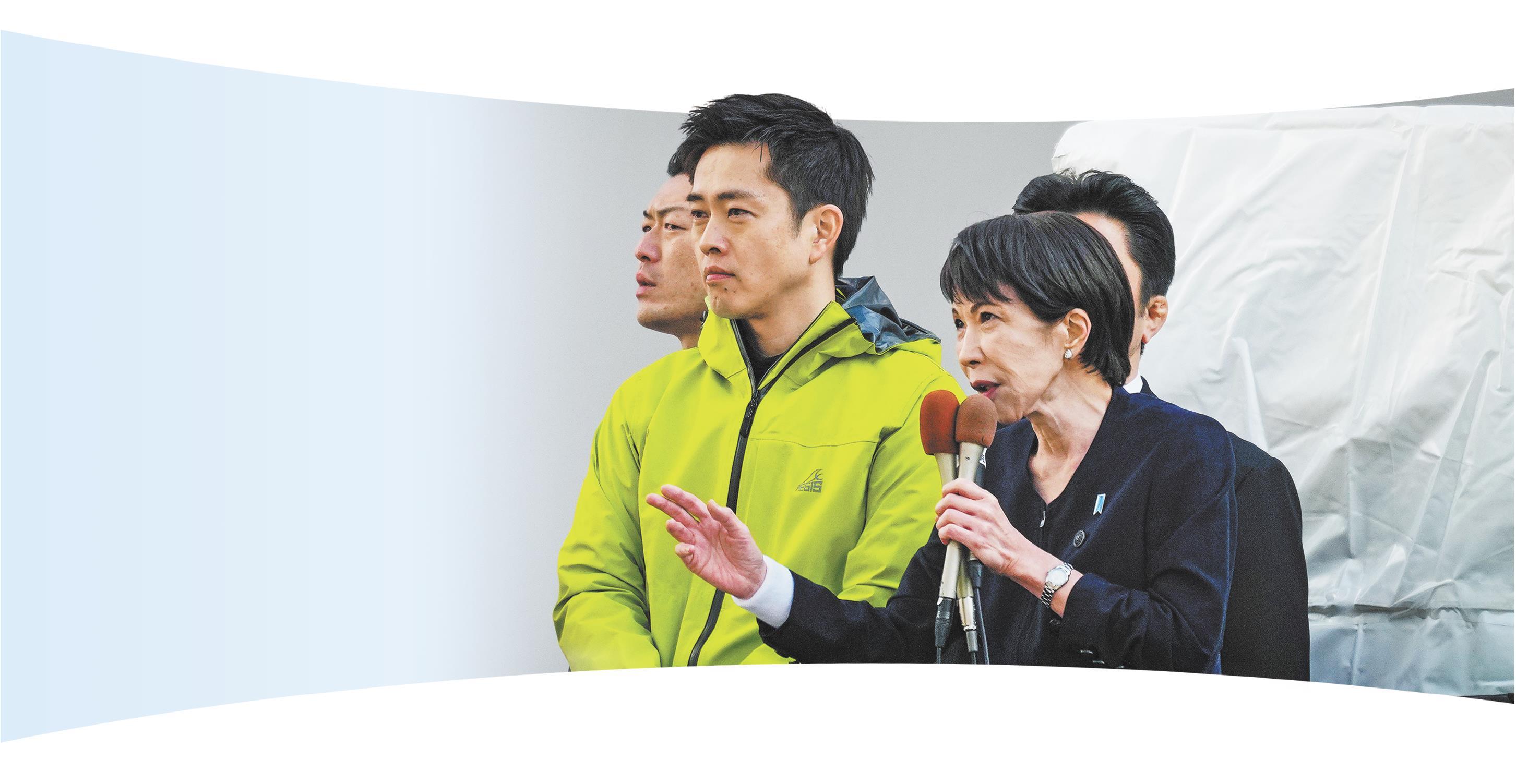 1月27日,日本首相、自民党总裁高市早苗(前右)、维新会党首吉村洋文(前左)在东京秋叶原车站附近出席街头演讲活动。(□新华社发)
