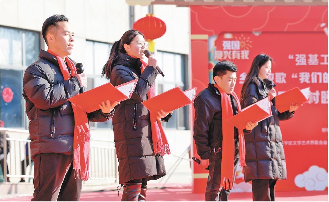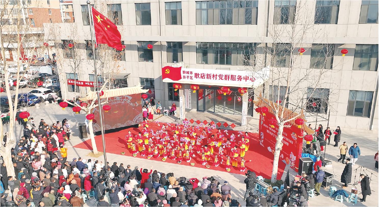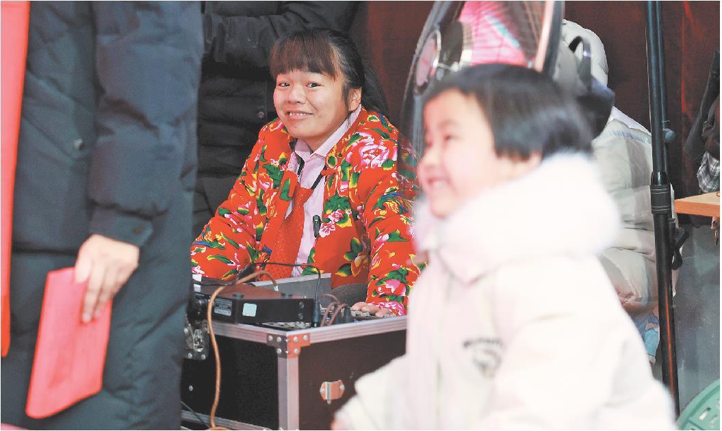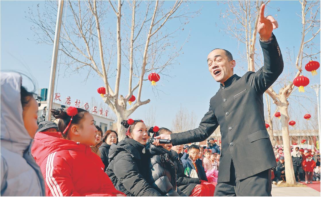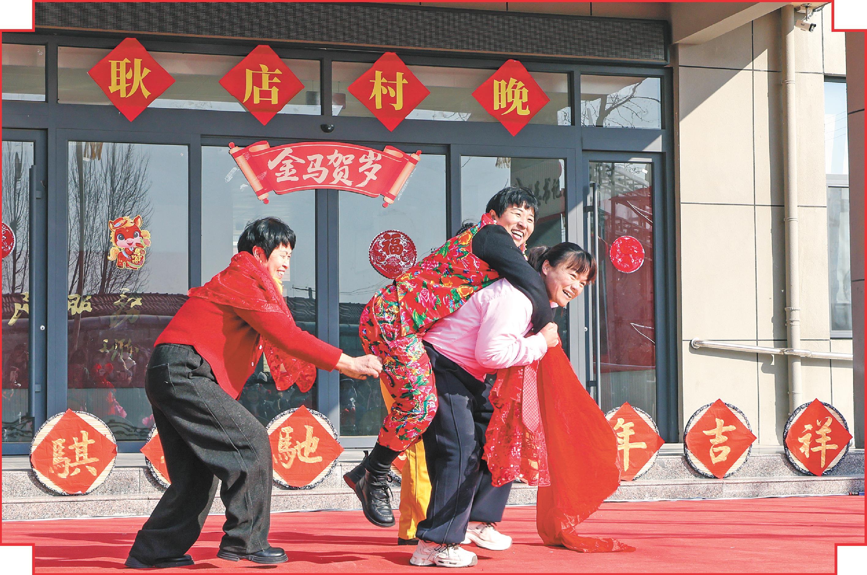 2月8日,耿店新村党群服务中心广场,村民耿红妍(右一)等人在耿店村晚表演搞笑串烧《嗨,你好呀》,引得观众欢笑鼓掌。